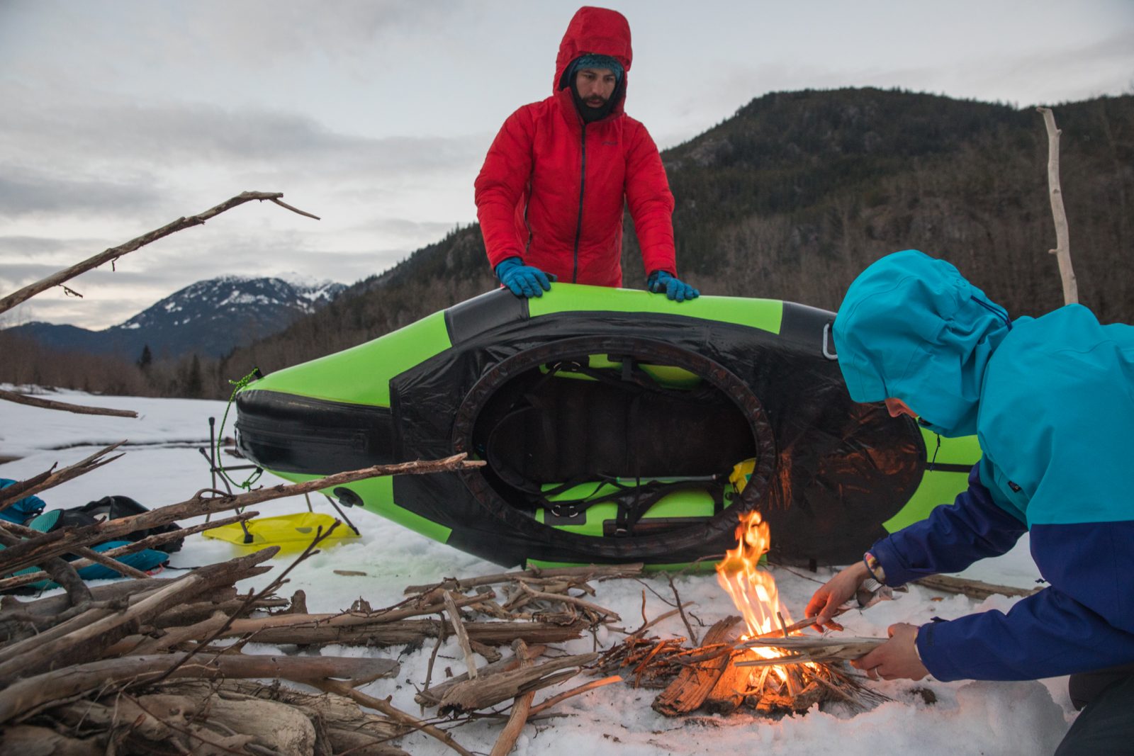 With gusting winds blowing outside, we were cold just thinking about the whitewater to ski touring trip we had planned for early February in BC’s Coast Mountains. But good friends will follow good friends into questionable adventures. So, I convinced my friends Andrew Burr and Rok Rozman to pack our skis and packrafts and take on water in all its forms.