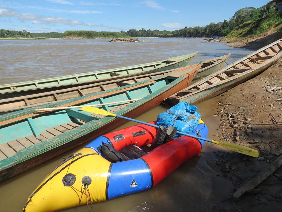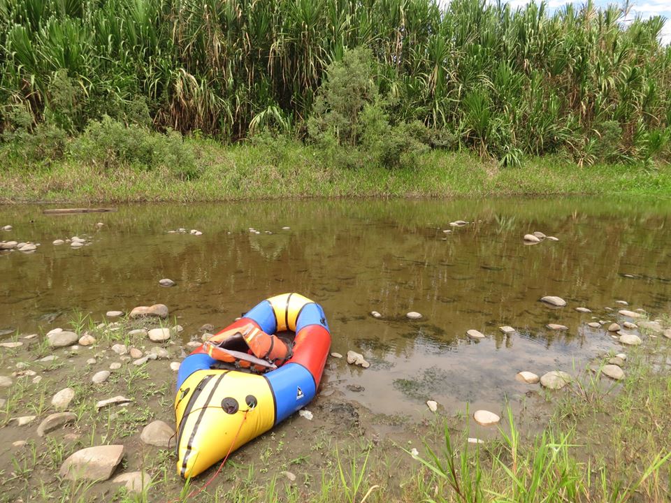 Trepidation filled me as I inflated my colorful Alpacka packraft and the fast, shallow whitewater of the tributary river of the Amazon, the Madre de Dios, rushed past me. The long walk in extreme heat, across beaches of dry season exposed rounded rocks, after walking trails through banana plantations and tall bamboo groves, had been gruelling.