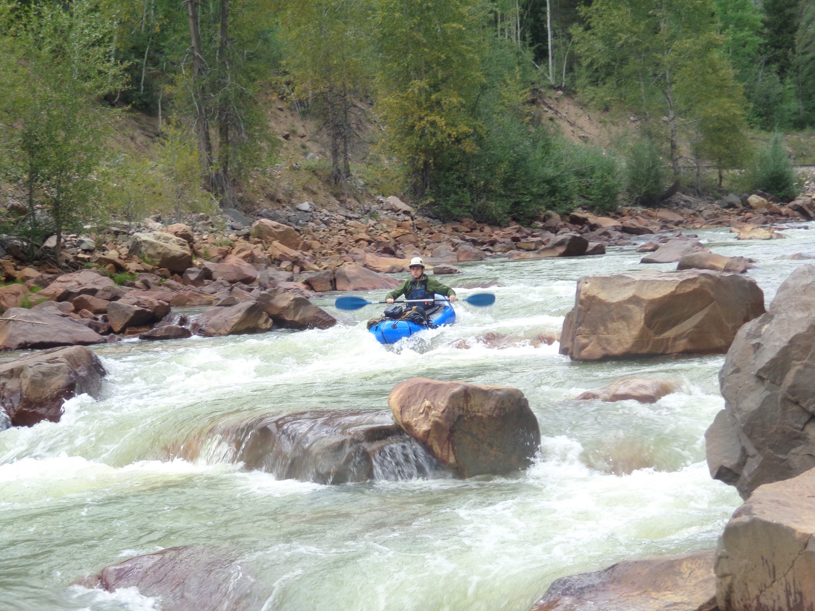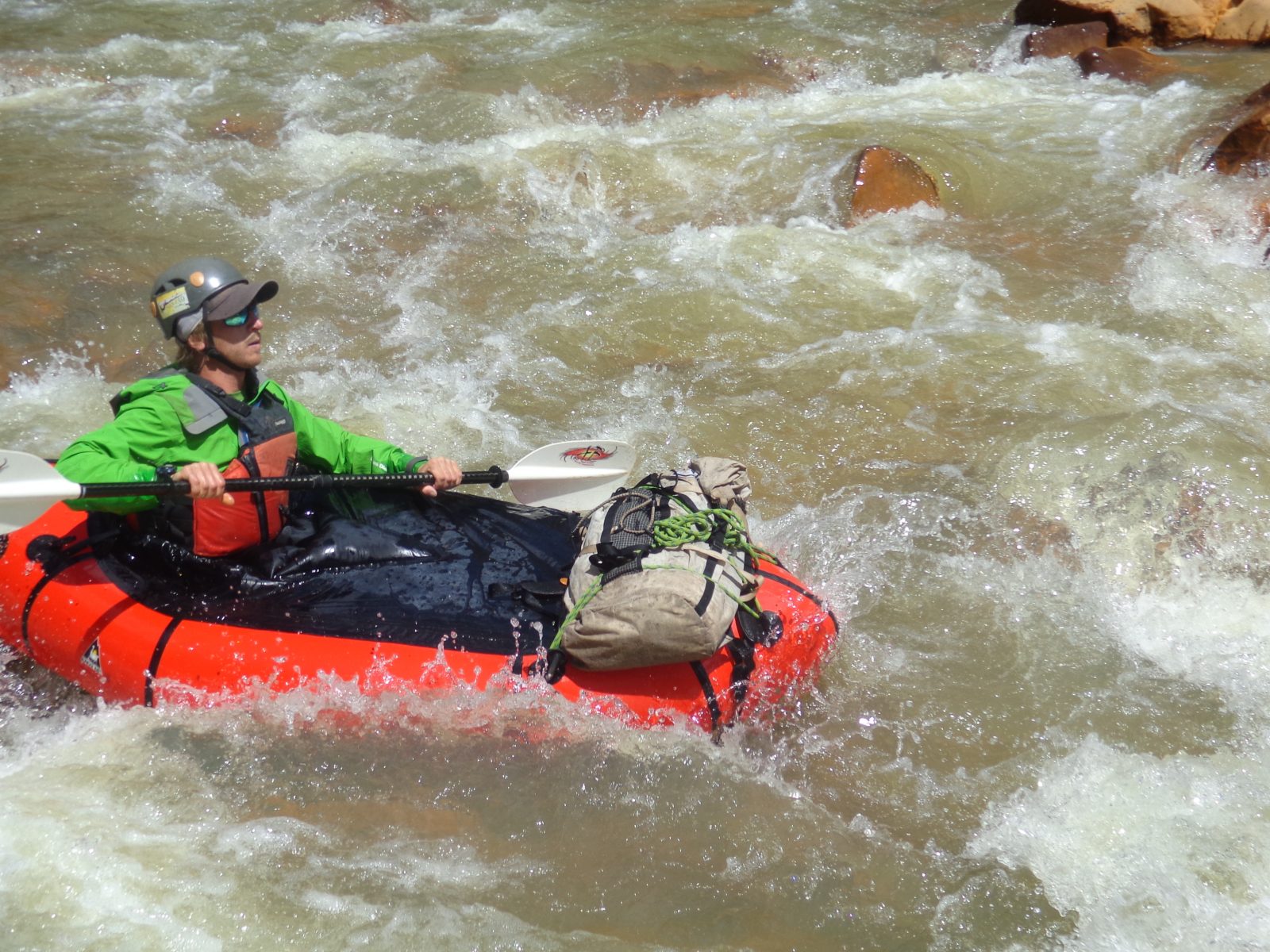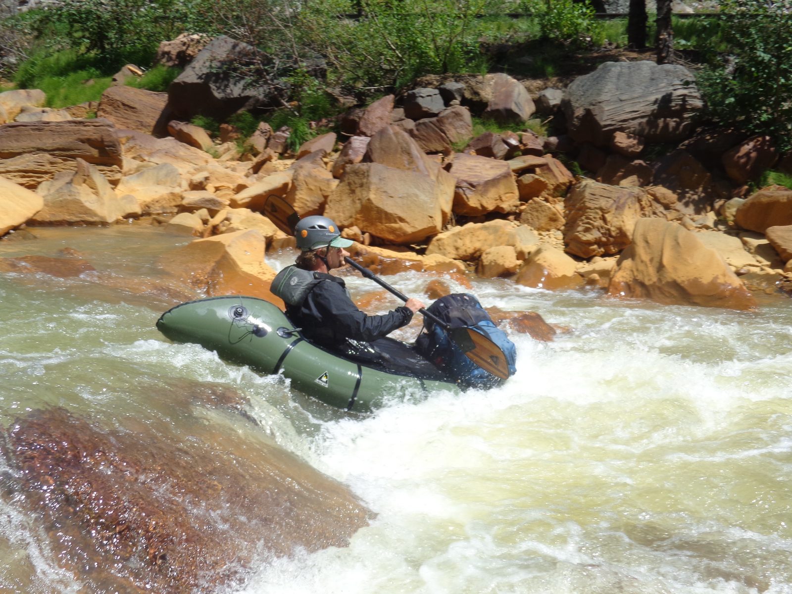 We put on the Animas at 120 cubic feet per second, roughly half of the lowest runnable recommended water level. Our boats were loaded down with all the necessary camping equipment, six days of food, two ropes, almost four sets of cams and nuts in a range of sizes, alpine draws, and some extra carabiners and cordelettes in case we needed bale or leave fixed anchors to rappel. We packed most of this gear inside light weight dry bags in the tubes of our Alpacka rafts, leaving only what we needed accessible throughout the day stuffed inside a backpack strapped to the bow of each of our one-person sized rafts.