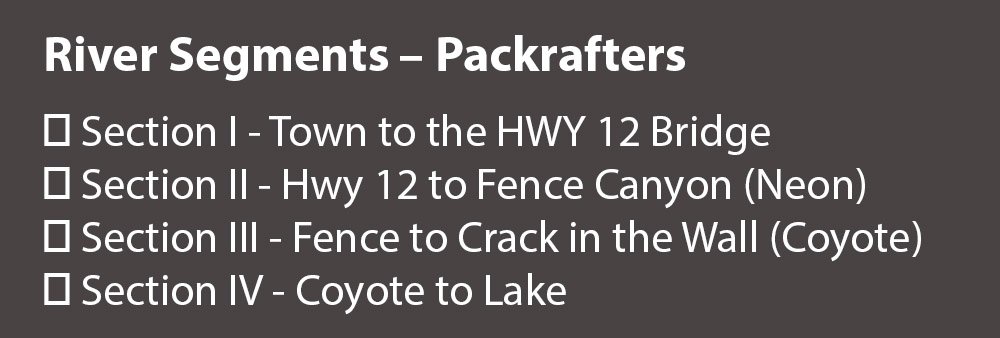 The Escalante River itself courses through a handful of different land designations as it winds its way through the area. There are four sections of packraftable river, with sections II and III being the most popular (see Sidebar). A change in the land designations for the river corridor can affect paddling access.