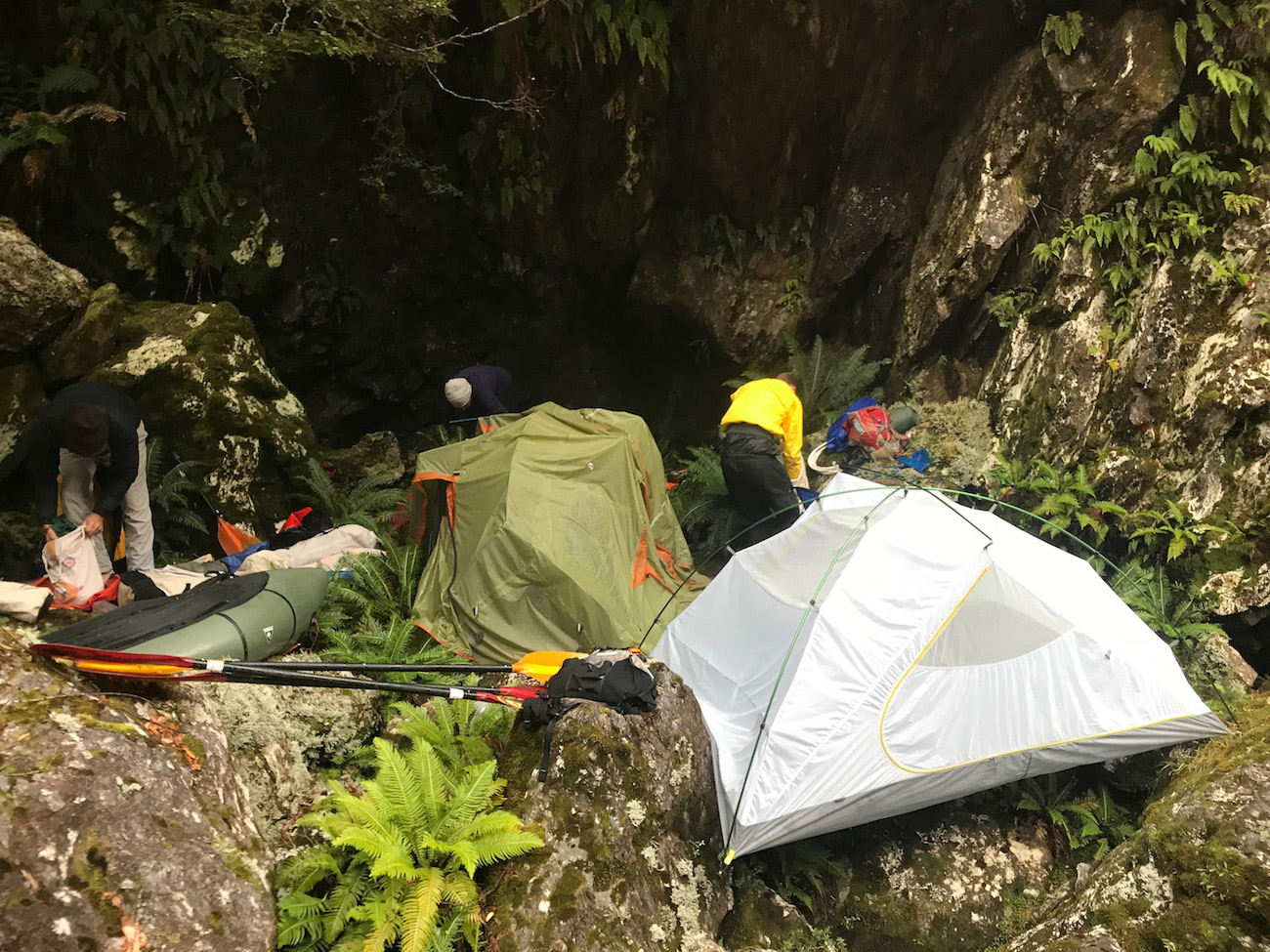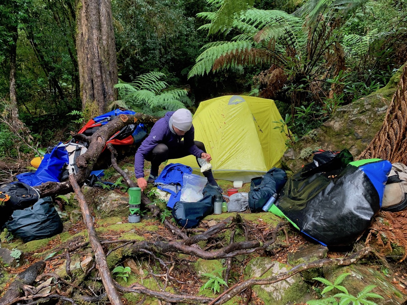 In April, Ben, Gus, Ed, and I loaded everything into Gus’s friend Blinky’s car in Hobart and drove the three hours to Donagy’s Hill Reserve on the Lyell Highway. We exploded our gear on the banks of the Collingwood River and made our first camp, crossing our fingers for nice weather. Anticipation for the unknown was growing.