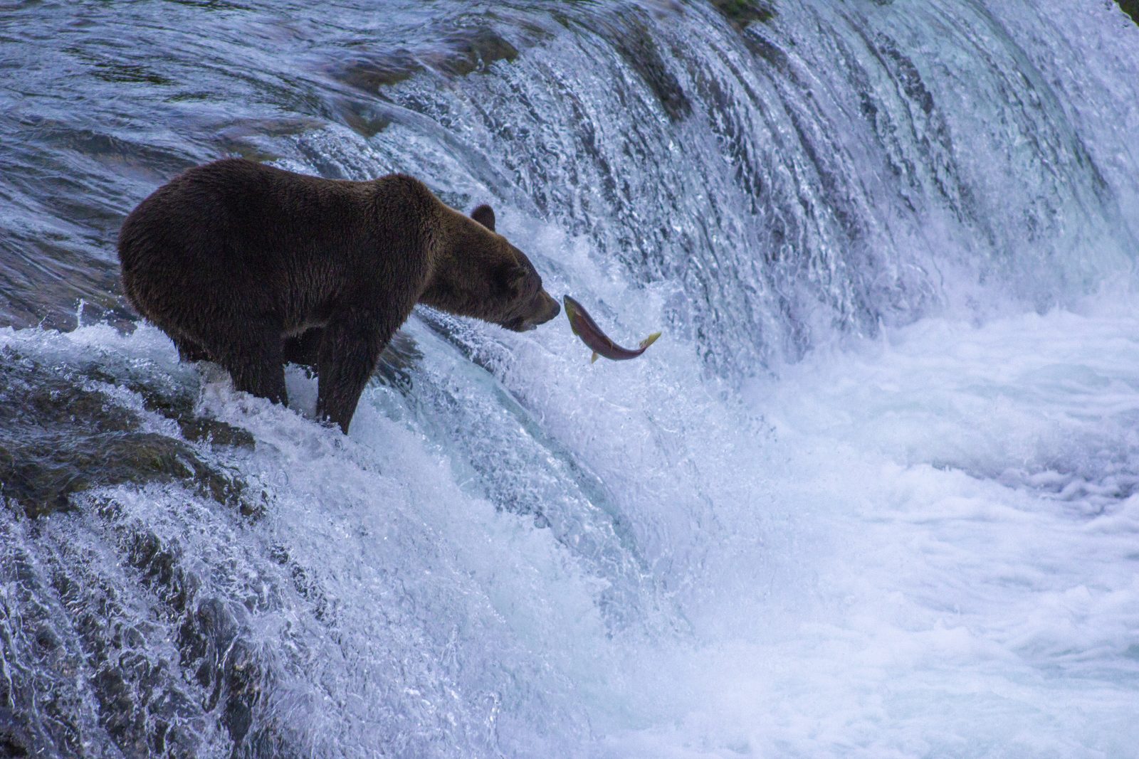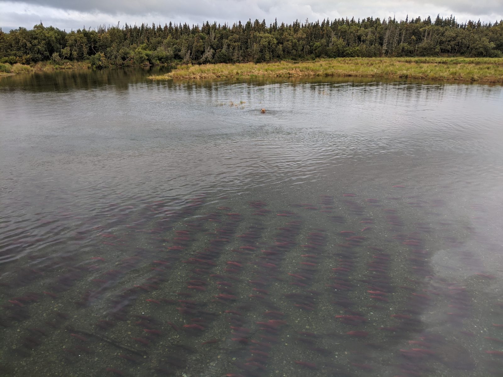 This region is part of the Bristol Bay watershed, the largest sockeye salmon fishery in the world. Every river, from 20 cfs to 20,000 cfs is filled with thousands of salmon during the right time in the summer. As the sockeye salmon migrate upriver from the ocean to the precise spot they were born, they change from silver to a bright cherry red color and their heads turn dark green. As I was jet-boating up the nearby Tazimina River, I thought to myself “This could be featured in National Geographic”. Crystal clear, turquoise waters were teeming with tens of thousands of bright red salmon swimming together in coordination. In Katmai National Park, you can watch brown bears “snorkel” for salmon from above.
