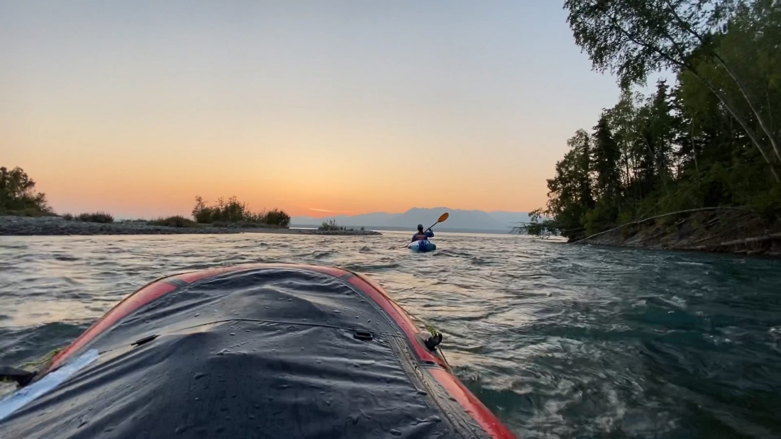 As we continued downstream, we had to pull over several times to look at salmon. Initially, we weren’t expecting to see to many actively spawning salmon, especially in the main channel, because of how swift the Tanalian River is. But much to our surprise, there were dozens of salmon at every river bend. As we approached Lake Clark, we found a spot to hammer in some rebar and attach a temperature logger. As we got off our packrafts, a once gloomy day turned into a miraculous display of rainbows and golden lighting.