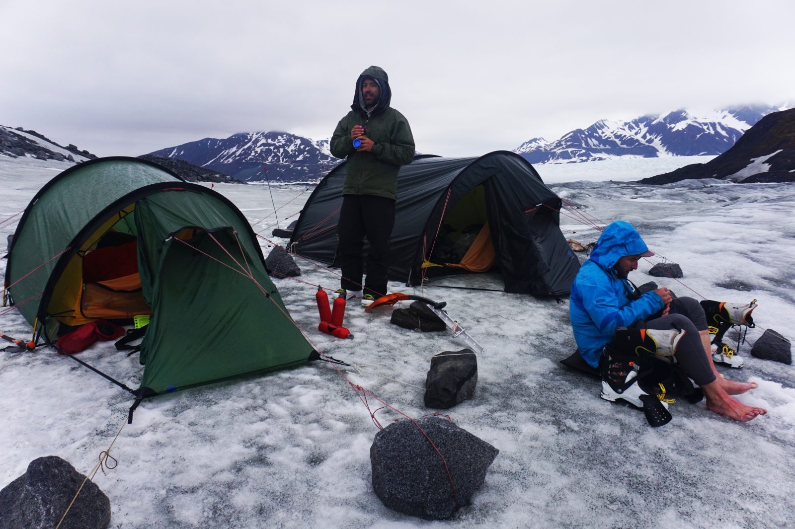 It took us an entire day, in low visibility, to shuttle our gear through the ice fall. Haines seemed impossibly distant and the weather was deteriorating. We found ourselves precariously shuttling our inflated packrafts across so they wouldn’t pull us into the cracks. We used an ice screw anchor and snow picket to belay people around the cracks. Piercing cold wild and rain drove into our faces for a few hours as we went through this process. I remember thinking, at one point, that it would be easier to just climb into a crevasse and curl up and go to sleep. We dropped a packraft down a crevasse and had to set up an ice screw anchor to retrieve it. It seemed strange seeing packrafts in this frozen, inhospitable land. With underwear and socks saturated, we continued pushing through. The thought of gaining elevation to have it snow rather than rain kept us trudging forwards. We finally made it through and skinned into a good compression zone with a rocky outcrop to provide our tents with some shelter from the wind.