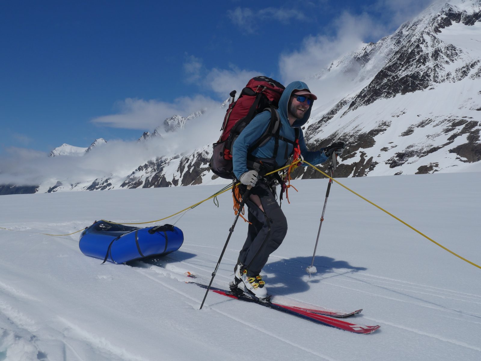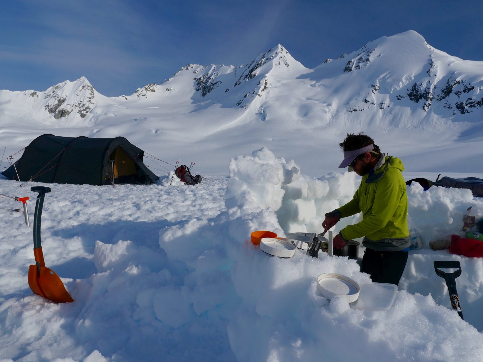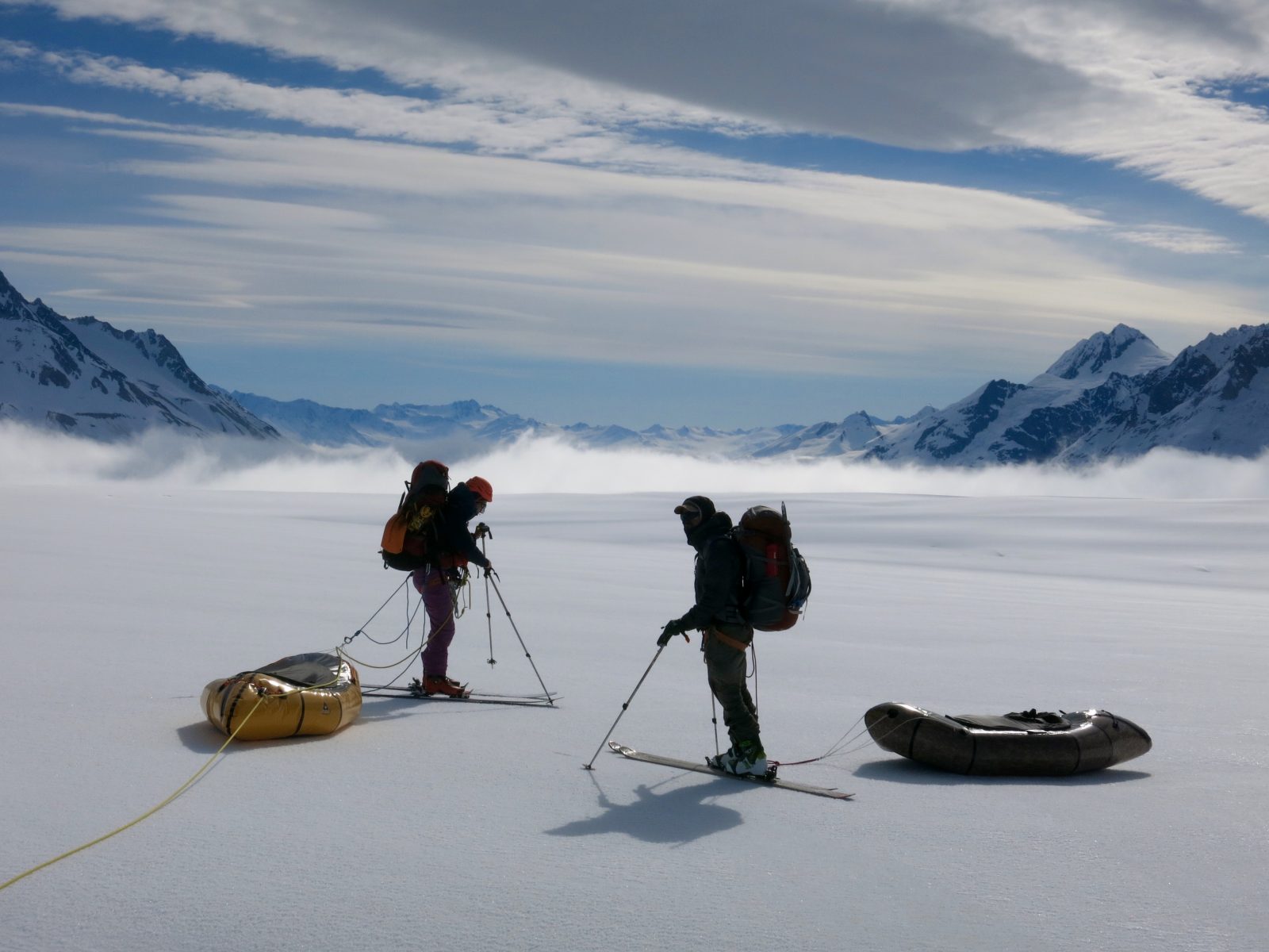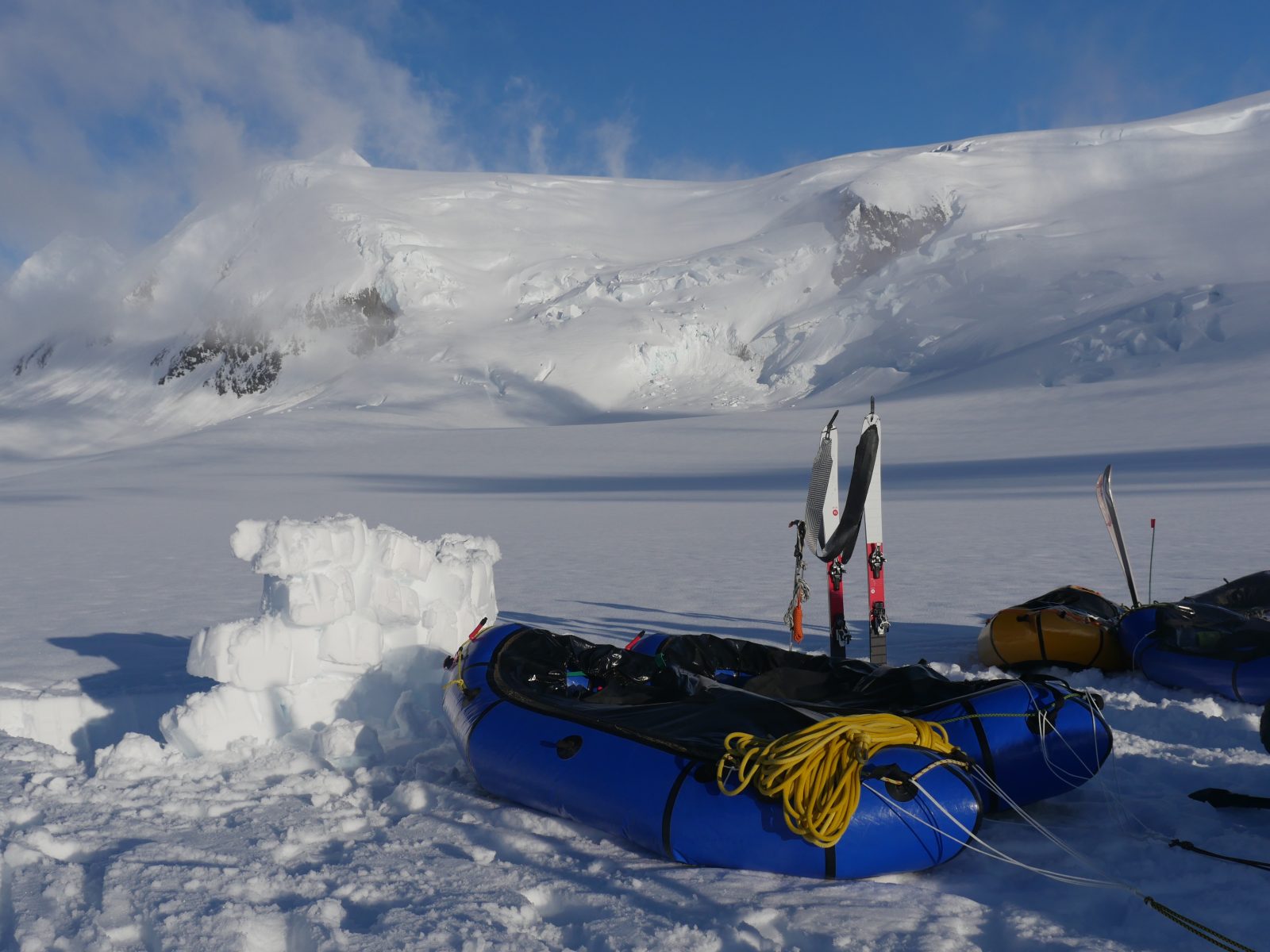 We spent 3 hours of our second bluebird day probing and then stomping out a 800m snow runway so Brett could be flown in to join us, along with a huge pile of food. With deteriorating weather and limited time, we made the decision to let go of our summit bid and prioritise the traverse. said Bruno. We sang Happy Birthday to Bruno and sat around laughing, drinking backcountry lattes and munching on fried mozzarella sticks. We continued down the Grand Plateau Glacier with 20 days’ worth of food, packrafting gear and skis.