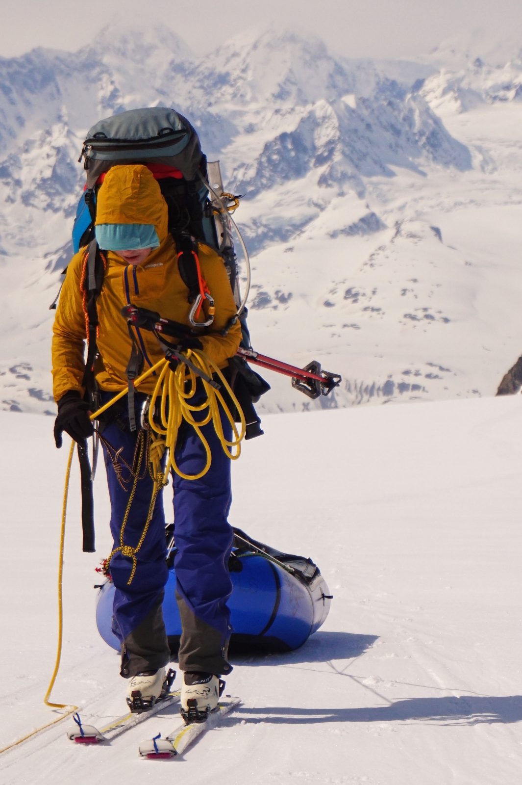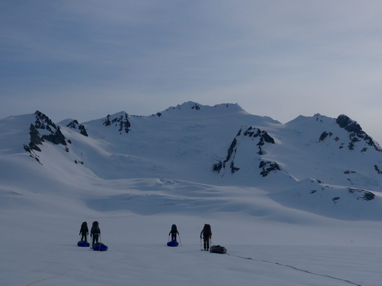 Waking up to clear skies and no wind, we all grinned as we skied across the border into Canada. Glacier life flew by, the days blurring. It’s a land of extremes. It was either freezing cold and super hard to get out of our sleeping bags or baking hot with no cover from the Death Star, sucking energy from us and making us all look haggard and raccoon-eyed. Fresh grizzly and wolverine prints criss-crossed the snow, reminding us that we, as humans, were merely passing through. A never-ending expanse of white giants stretched out to the horizon. We made moraine camps, snow camps and one magical camp with a patch of greenery, a worried Arctic ground squirrel and a few birds. We plodded on. The “Alaska factor” hit us hard many days, when you estimate your distance based on sight but it ends up being three times as far. The longest glacier in NZ is the Tasman, at around 20 km, whereas in Alaska it’s the Bering, over 200 km.