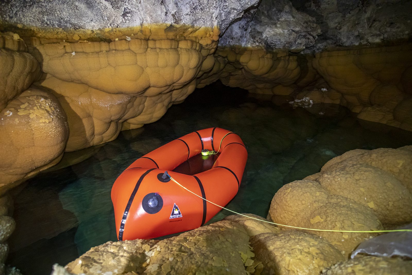 There are few places on this earth where the by-products of human progress are virtually non-existent. As life on the surface is subjected to countless externalities like pollution, extraction, and overuse, Lechuguilla Cave will remain a refuge for discovery, and home to some of the only true wilderness left on earth. Places like Lake Castrovalva are increasingly important, where unimpacted environments can be carefully studied and observed. To this end, it was of utmost importance to leave minimal traces of our passing as we sought to produce an accurate survey of what lay beyond Castrovalva’s rimstone shores. Swimming across was out of the question for obvious impact reasons, so we opted to utilize a disinfected 3.25-pound Alpacka Scout packraft. With minimal impact, our team easily paddled to the far side of the lake to tackle our survey goals, including the photo-documentation of this magical lair.