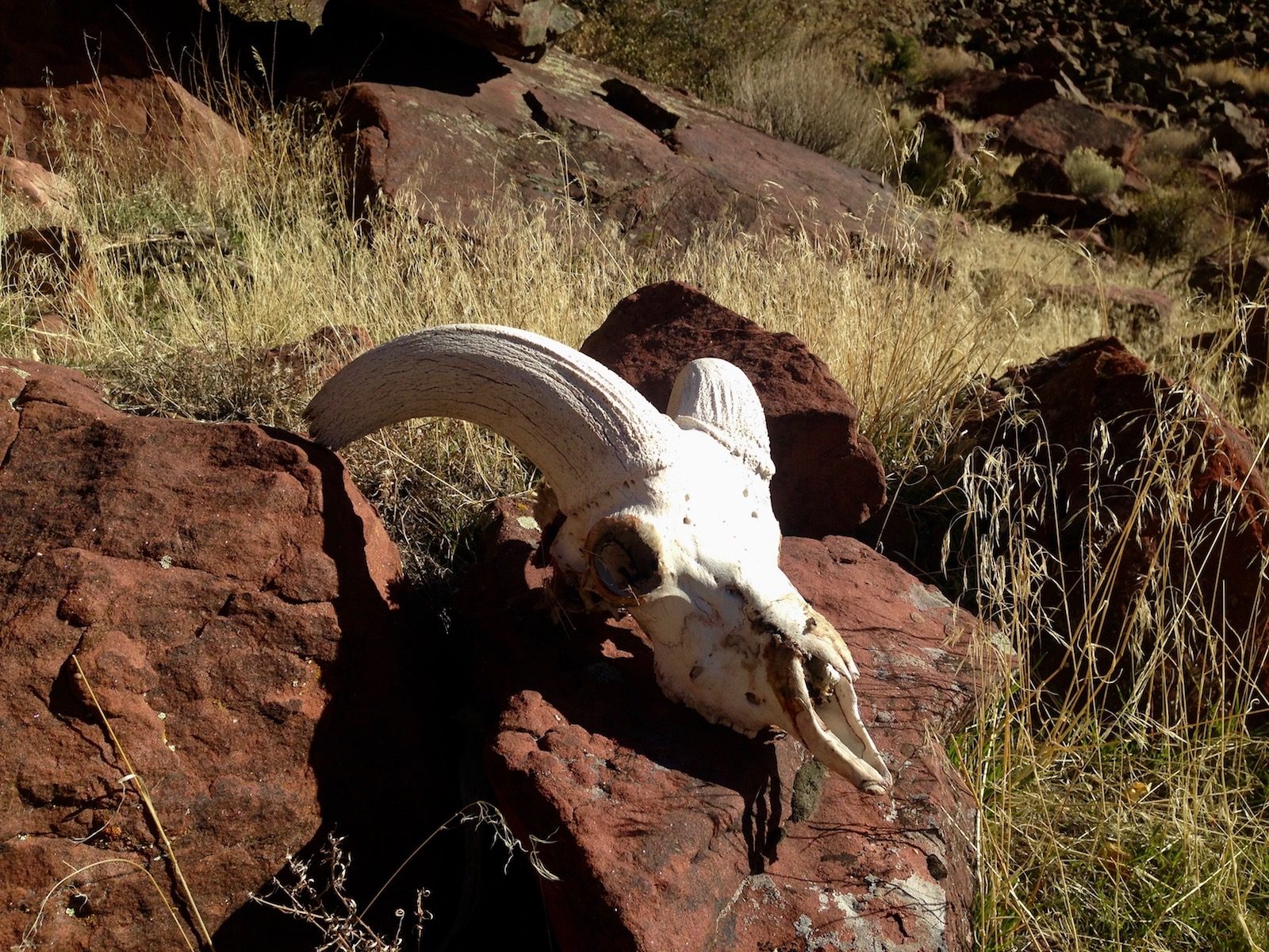 On our layover day we explored a side canyon, reaching a small summit of the canyon wall. We sighted our first bighorn sheep, although this one happened to be past desiccation, its curling horns and skull bleached white from the sun.