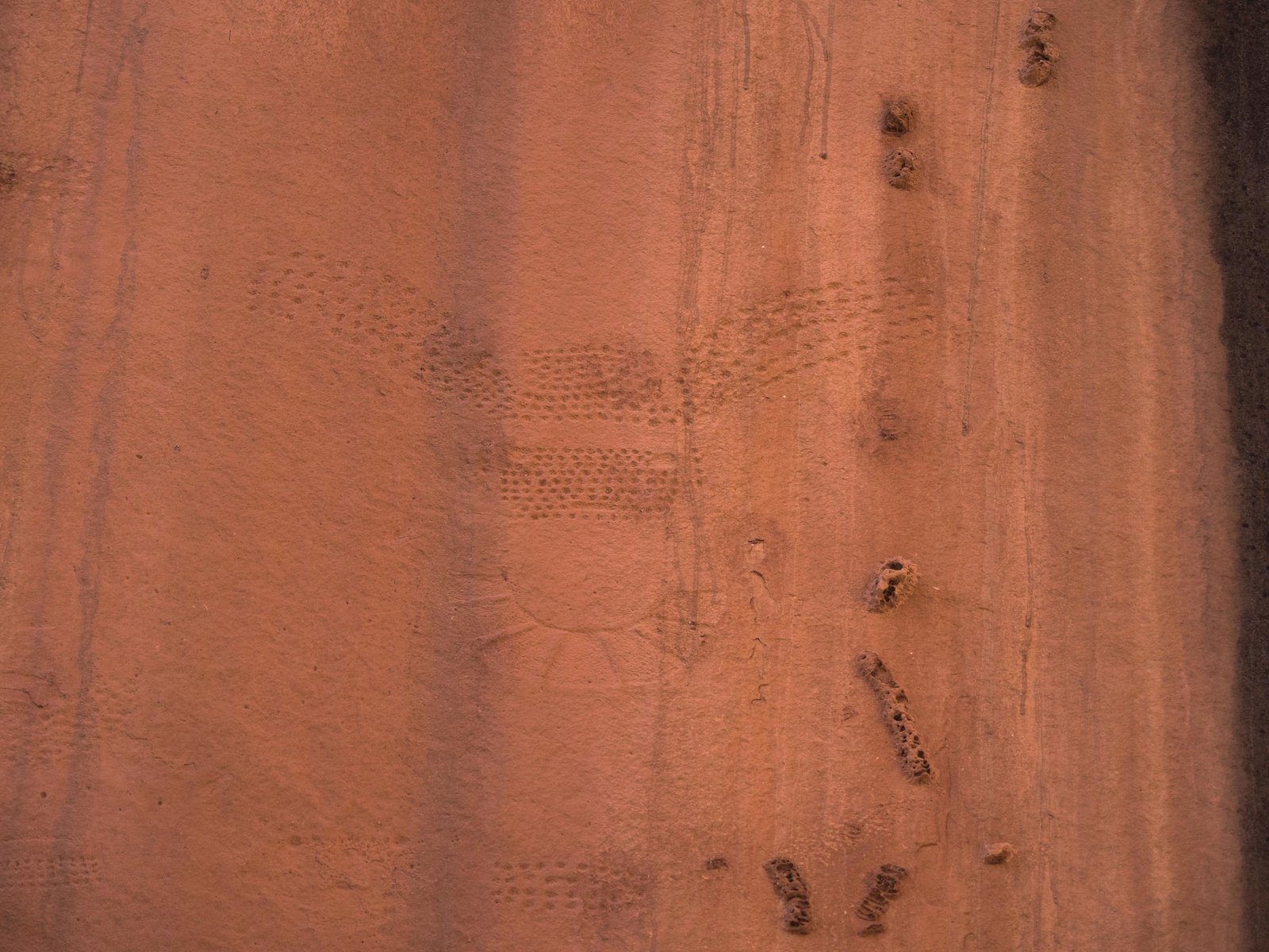 Just barely visible, the artists had stippled them into red sandstone instead of the dark varnished sections of rock. So, the patterns were only discernible with the faint shadows the shallow indents cast. The mere height this rock art existed above ground level attested to their age. Hundreds of years of flash floods had slowly eroding the ground below them.
