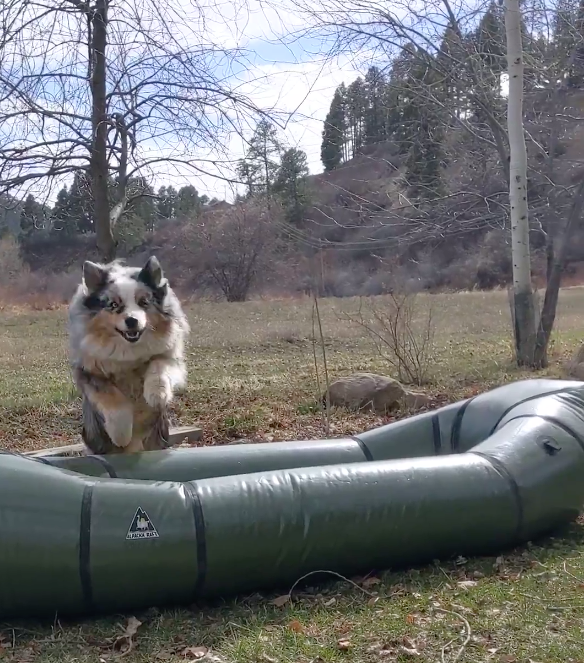 My dog was starting to find the same old walk around the neighborhood were quickly becoming a bore. And quite frankly, so was I. Outside we go, with packraft in tow. I got creative and set up a little obstacle course of doggie fun. Anything for treats from that one. And even better, belly laughs from all.