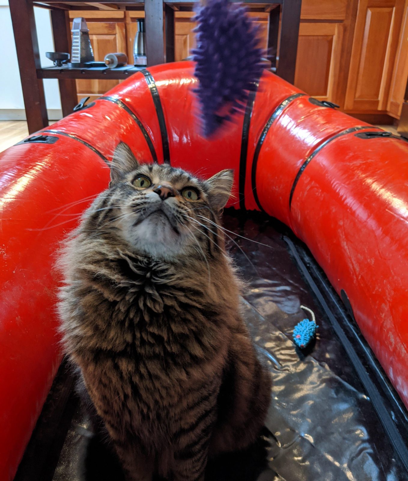 When your cat starts driving you crazy and he’s becoming a bit stir crazy too. It was time for a kitty packraft play time intervention as well. So, in the packraft we go, with as many fake cat mice toys we could find.