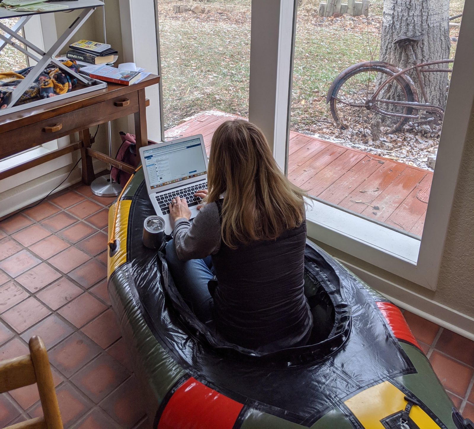 Switching up the home office was kind of fun. Luckily most of my job includes being on my laptop, so I spent my workday using my packraft as my desk, coffee and all.