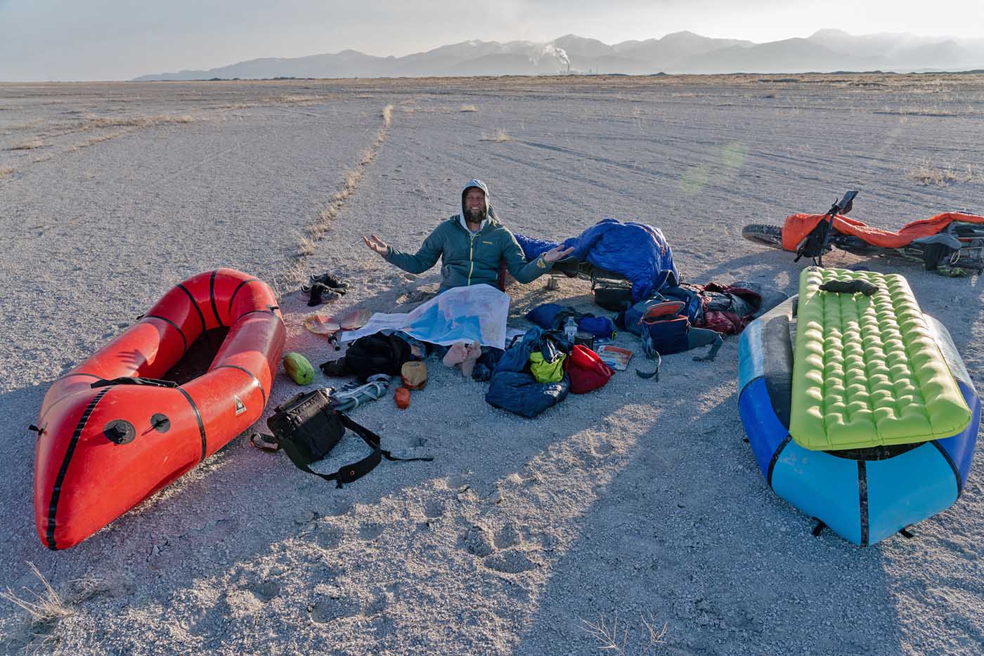 Andrew Burr conceived of our latest trip to circumnavigate the Great Salt Lake by packraft and fat bike. He found inspiration living for 20+ years next to the Great Salt Lake and frequently flying over this other planetary landscape countless times. We’ve done numerous wild bike trips together, and he knew I would be one of the few people keen on trying this improbable loop with him.