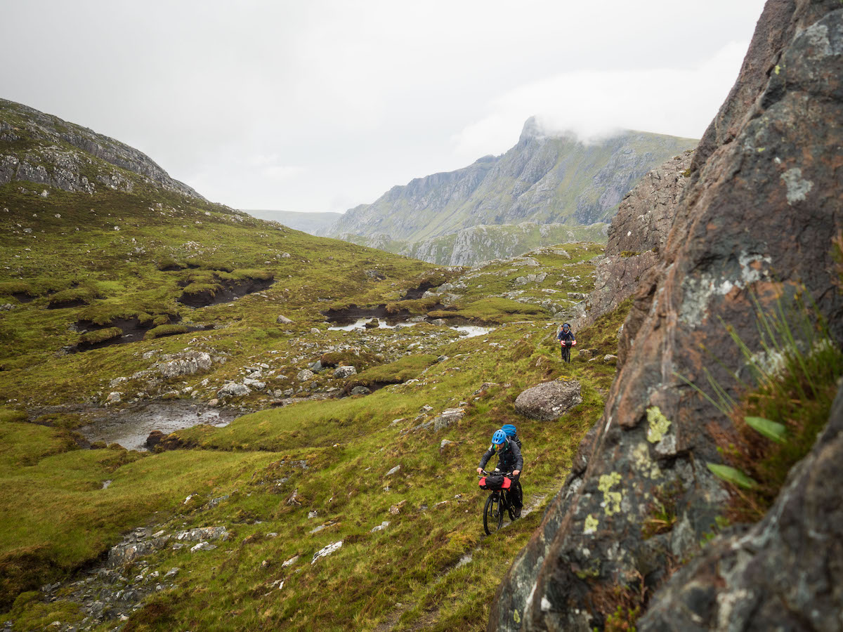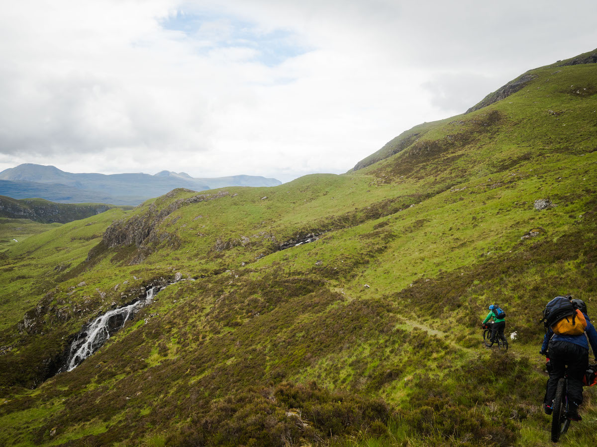 On our bikes, the rain finally let up. The single-track, although slowly disappearing back into the peat, led us on a sinuous line. It snaked through amazing scenery, crags, and head-deep peat hags on either side. Dropping off sharply, our concentration kicked in as we turned tight switchbacks. We paused only to look down on an amazing waterfall and herd of estate ponies, out at grass till the shooting season.