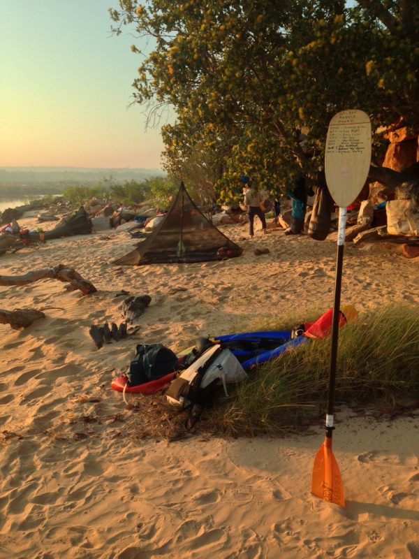 A day of alternating Drysdale flatwater lakes, tree sieves, and minor rapids ended at a major cascade that looked like runnable Class IV. Camp was just in sight along the pool below, a lovely wide sand beach backed up to a small escarpment shaded by flowering trees. The pull of shade, food, and rest overcame better judgement, resulting in a busted paddle. Our toy spare paddle didn’t look competent for the 60 kms of river remaining. But lucky for us Dulkara had brought the Golden Paddle prize along for the trip, and it was just the thing we needed. A fireside evening of McGuyver splinting, whitling, drilling, and taping created a Golden Werner hybrid with good balance and heft.