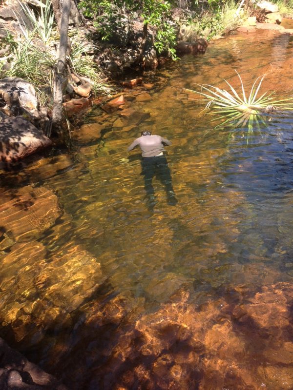 The pools of the Carson got longer, deeper, and more overhung. They got creepy. We nervously scanned the banks for tail drags and eyelids just above waterline. Every single freshie got a close inspection. Feeling stuck between a crack and a deep spot, we made our last camp on the Carson, facing an 80 km walk through the heat to Kalumburu.